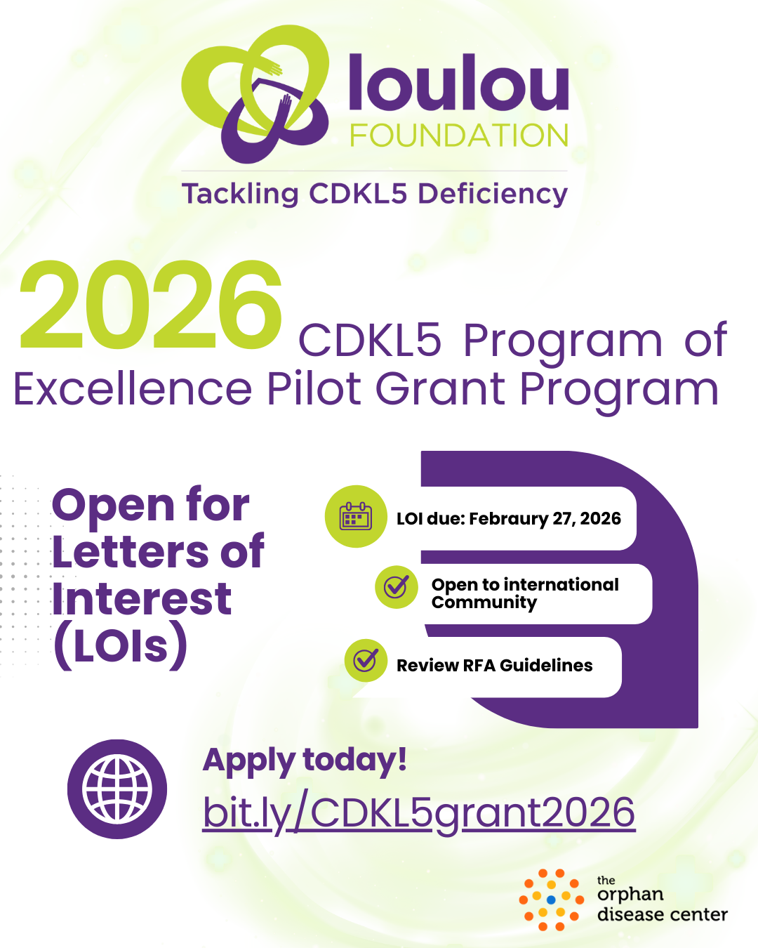 The ODC and Loulou Foundation CDKL5 Pilot Grant Program provides a one‐year grant for $150,000.00 (total cost) to support research related to CDKL5 Deficiency Disorder (CDD). The number of awards is not fixed, and may vary.